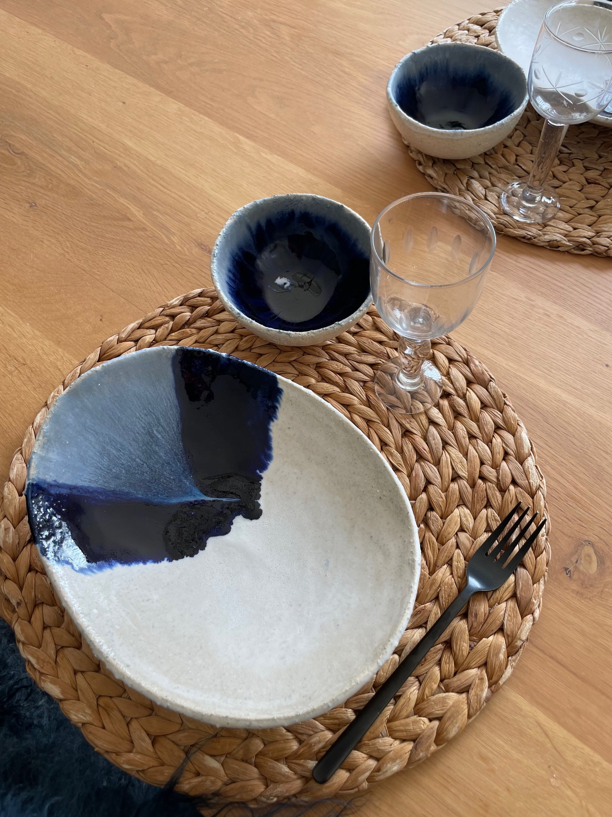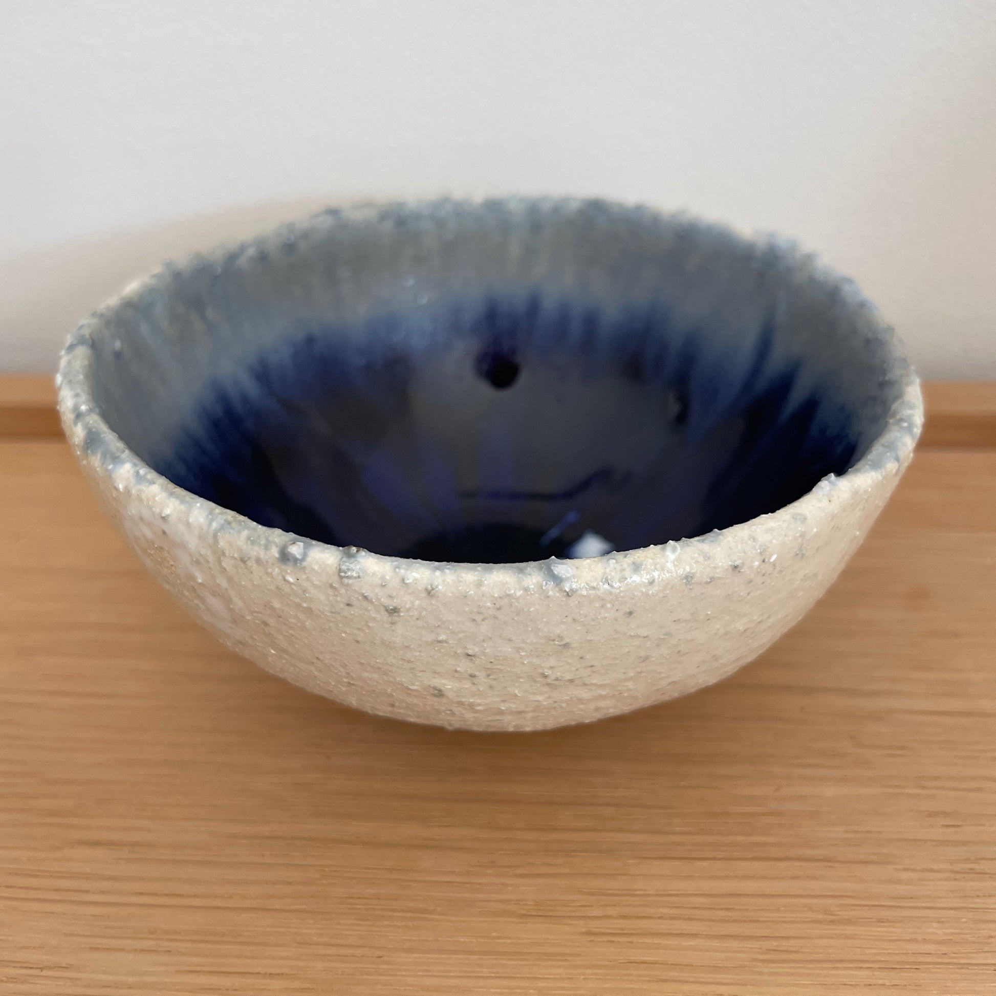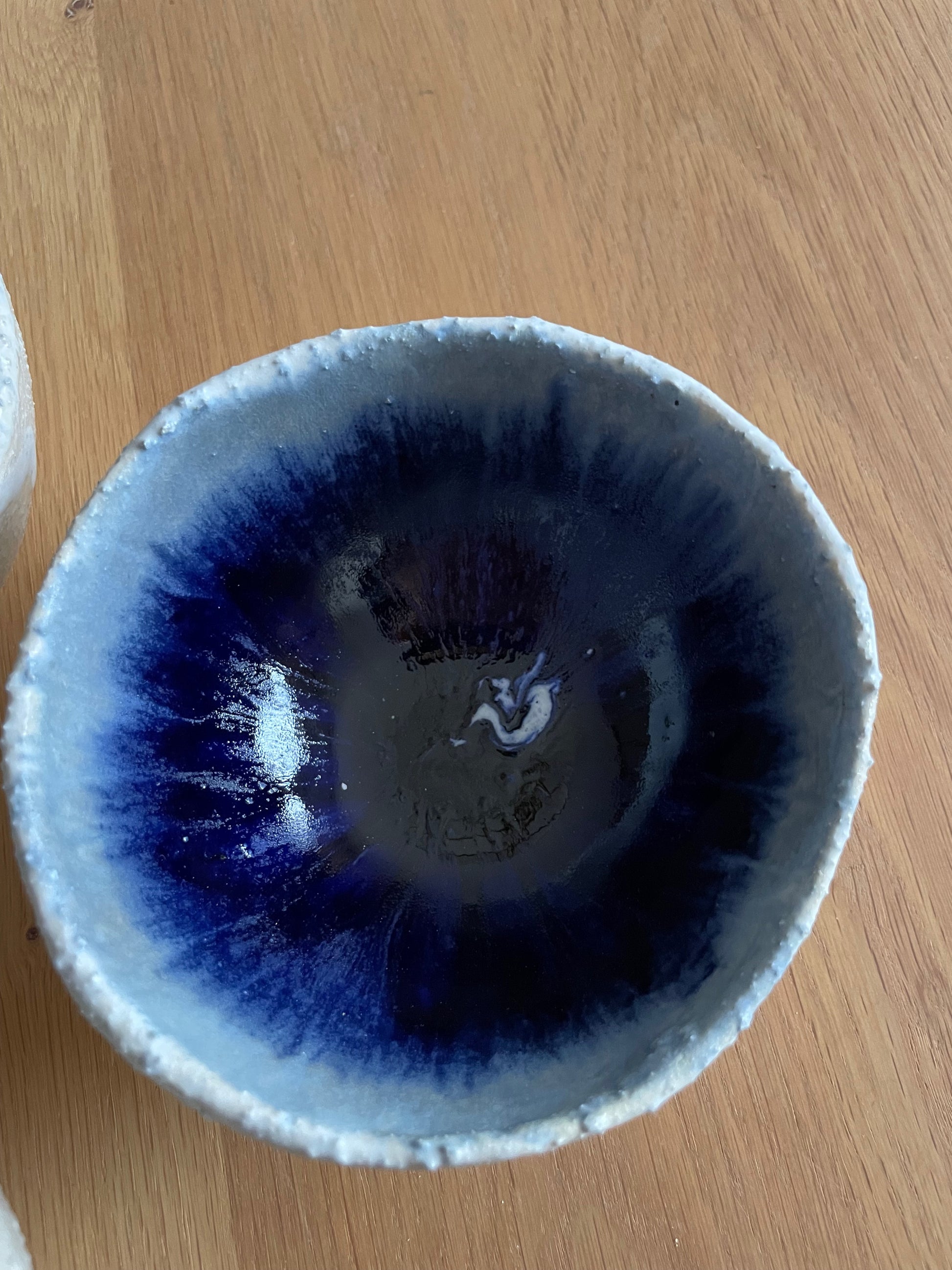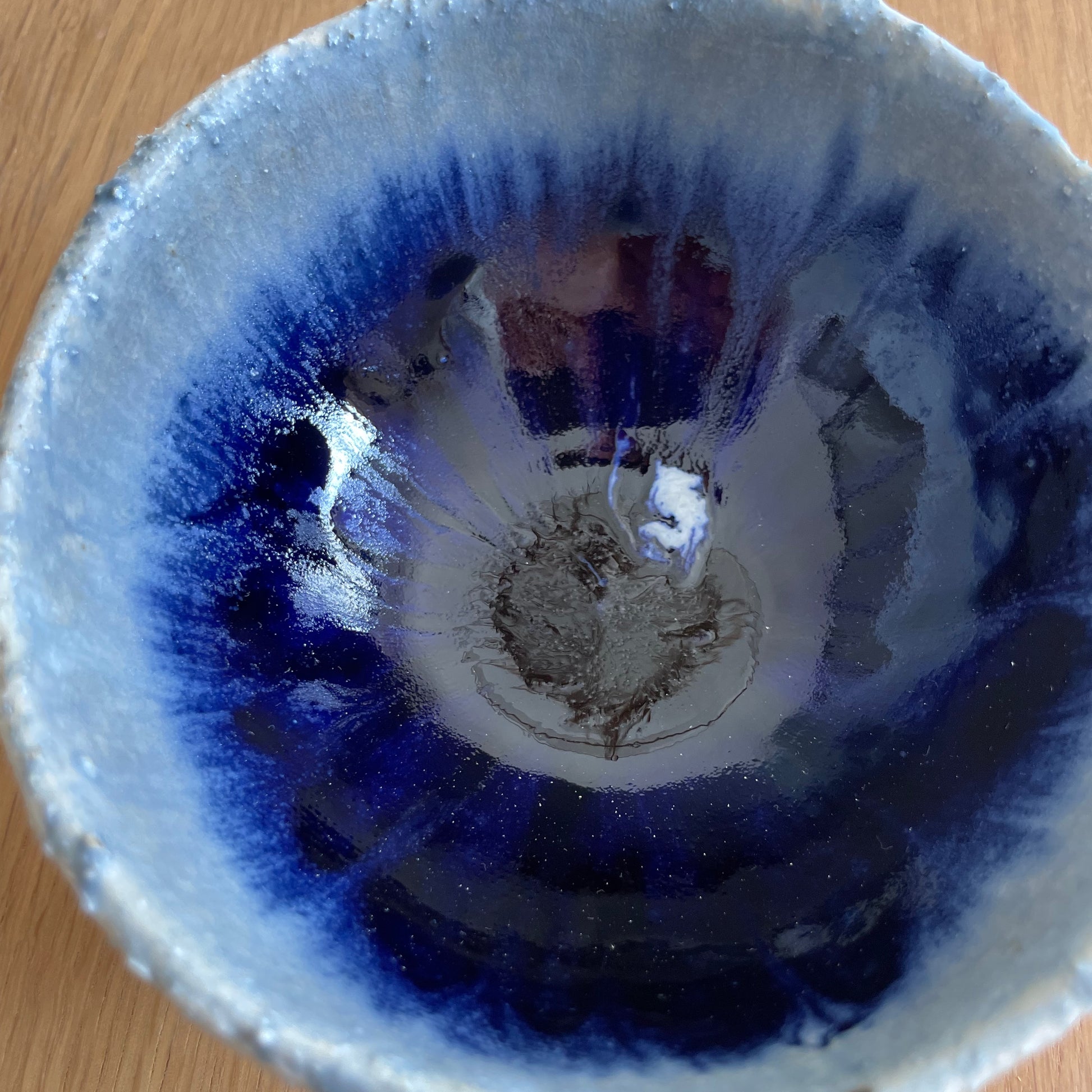 Bol en grès chamotté, bleu glacier et bleu indigo à l'intérieur et blanc cassé à l'extérieur. Chaque pièce est unique, réalisée et émaillée à la main.
